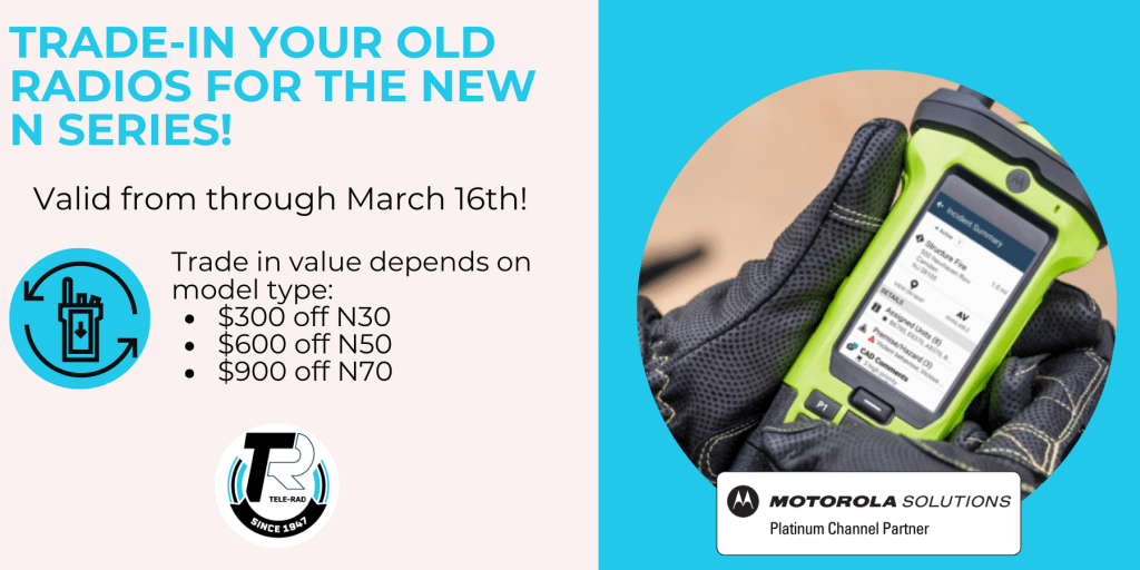 At Tele-Rad, Motorola radio promotions provide your business or organization with the opportunity to upgrade your current wireless radio communications equipment and start using the latest wireless technology. If you’re new to using Motorola, promotions are an opportune time to start using two-way radios for your communication solutions.